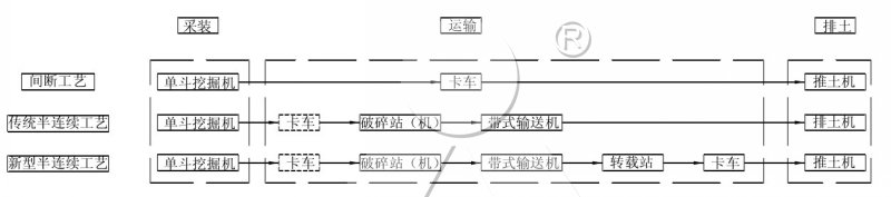 該半連續工藝的主要特點為采用轉載站一卡車排土方式,替代傳統的帶式輸送機一排土機配合方式。新型半連續工藝與間斷工藝和傳統半連續工藝的比較如圖所示。