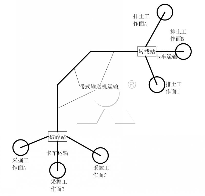 半連續工藝實際已在露天礦采礦作業中得到廣泛應用,如典型的單斗挖掘機一卡車一破碎站一帶式輸送機一選煤廠一裝車站一列車系統,從整體看即屬于該類型;由于中間設置有選煤廠這樣一個很大的緩沖環節,使得連續運輸向間斷運輸轉載的過程并不明顯,因此現有研究主要集中于間斷一連續工藝環節。但對剝離半連續工藝而言,運輸過程中不可能設置如此大容量的緩沖倉,必須對該類半連續工藝的適用范圍、轉載方式等進行具體研究。