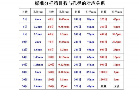 篩網目數和孔徑對照表