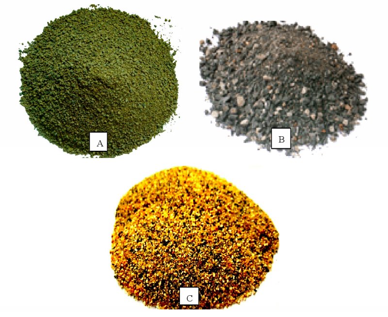 針對石料的形狀劃分了六種不同類別,分別是:圓型、不規則型、角錐型、扁平型、長條型及扁長型。在這六種形狀中,可以用角錐型和不規則型形容機制砂的粒形。機制砂的粒形因母巖種類不同、機制砂生產設備不同也會不同,如下圖A、B兩種機制砂是不同生產設備制備的機制砂,A的粒形較好,B的粒形較差,C是與A、B母巖不同的機制砂,顏色接近黃沙。